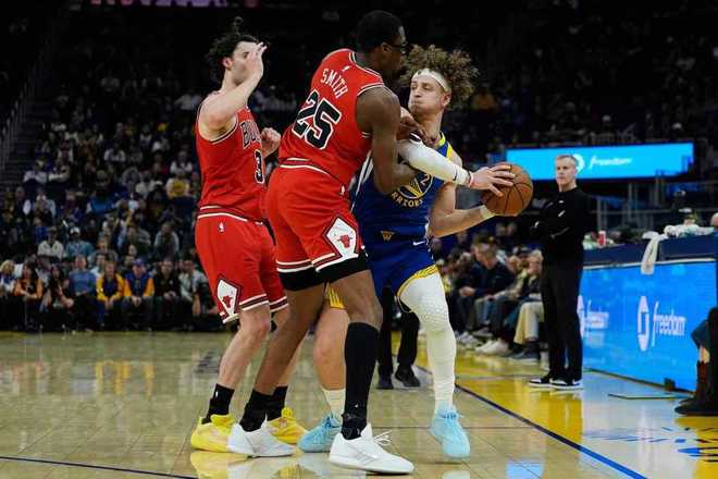 勇士過去兩場連續客場輸給雷霆與爵士遭遇2連敗,公牛上一場客場110-126輸給國王,本賽季首次交鋒勇士客場123-91大勝公牛。本場勇士缺少庫裡兄弟、波爾津吉斯、巴特勒等,公牛缺少西蒙斯、艾維與科林斯。首節開局,追夢與桑托斯接連三分命中取得8-3領先,公牛連得6分反超。雙方交替領先纏鬥至勇士18-15,公牛一波7-0攻勢反超4分。勇士內外開花一波12-4攻勢奪回領先,首節比賽結束勇士30-26領先公牛。首節勇士三分18中8,但兩分僅6中1,公牛26中11,其中三分14中4。