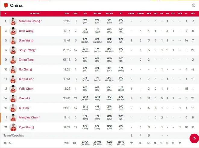 此外,李月汝21分11籃板1助攻1搶斷,楊舒予14分5籃板7助攻1搶斷,韓旭14分4籃板3助攻1蓋帽,張子宇12分3籃板1蓋帽,羅欣棫8分7籃板1助攻,王思雨6分3籃板5助攻。
